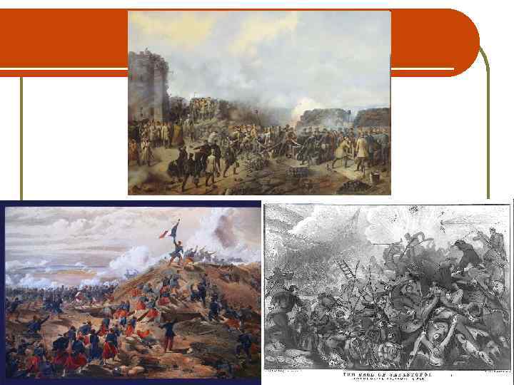 Осада Севастополя l l l 14 -18 сентября 60 -тыс. анго-французская армия высадилась вблизи Евпатории и двинулась к Севастополю. Русская армия, пол командованием А. С. Меньшикова попыталась задержать, но неудачно. Меньшиков отступил к Севастополю, а затем к Бахчисараю, бросив Севастополь на произвол судьбы. Август 1855 г. М. Д. Горчаков предпринял неудачную попытку на Чёрной речке снять осаду Севастополя, но был отбит. Севастополь оказался целиком на попечении гарнизона. Организатор обороны Севастополя адмирал В. А. Корнилов, его ближайшие помощники адмирал П. С. Нахимов и военный инженер Э. И. Тотлебен стали «героями, достойными древней Греции» . Севастополь был неприступен с моря, но легко уязвим с суши. Создана система сухопутных укреплений, моряки переведены с кораблей в город. Севастопольский гарнизон состоял из 50 тыс. бойцов. Слайд 10 17 – 19 октября 1854 г. – первая бомбардировка города, неудача и началась осада города. 17 октября 1854 г. гибель Корнилова и оборону Севастополя возглавил Нахимов. Осада города длилась 349 дней. Слайд 9 Март 1855 г. погиб Истомин и смертельно ранен Нахимов, но защитники держались. 8 сентября 1855 г. французам удалось взять господствующий над городом Малахов курган, дальнейшее сопротивление стало бесполезным. В этот день защитники города затопили корабли, взорвали уцелевшие бастионы и оставили город. Слайд 11 Осада Севастополя истощила силы союзников, им удалось занять несколько крымских городов, но прорваться из Крыма в глубь России не рискнули. Ноябрь 1855 г. - успешные бои на Кавказе. Начинаются мирные переговоры.