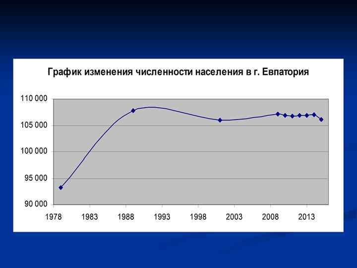 Население Количеств о жителей Евпатори и Годы 93 281 1979 107 792 1989 105 915 2001 107 177 2009 106 846 2010 106 698 2011 106 840 2012 106 877 2013 107 040 2014 106 115 2015