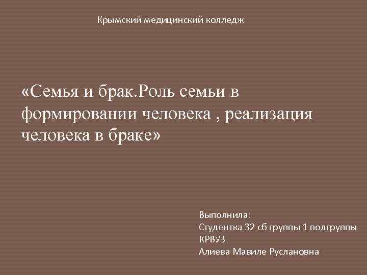 Крымский медицинский колледж «Семья и брак. Роль семьи в формировании человека , реализация человека в браке» Выполнила: Студентка 32 сб группы 1 подгруппы КРВУЗ Алиева Мавиле Руслановна