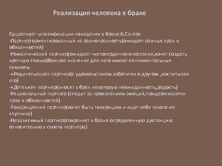 Реализация человека в браке Существует классификация поведения в браке К. Сагера -Партнер ориентированный на равноправность(ожидает равных прав и обязанностей) -Романтический партнер(ожидает чистосердечного согласия, хочет создать крепкую семью)Важное значение для него имеют сентиментальные символы - «Родительский» партнер(с удовольствием заботится о другом , воспитывая его) - «Детский» партнер(вносит в брак некоторую неожиданность, радость) -Рациональный партнер (следит за проявлением эмоций, придерживается прав и обязанностей) -Товарищеский партнер(хочет быть товарищем и ищет себя такого же спутника) -Независимый партнер(сохраняет в браке определенную дистанцию относительно к своего партнера)