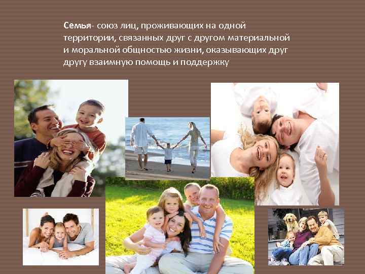 Семья- союз лиц, проживающих на одной территории, связанных друг с другом материальной и моральной общностью жизни, оказывающих другу взаимную помощь и поддержку