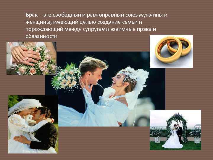 Брак – это свободный и равноправный союз мужчины и женщины, имеющий целью создание семьи и порождающий между супругами взаимные права и обязанности.