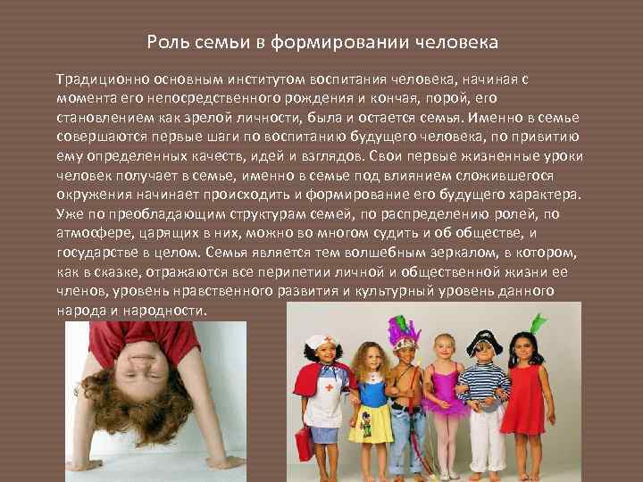 Роль семьи в формировании человека Традиционно основным институтом воспитания человека, начиная с момента его непосредственного рождения и кончая, порой, его становлением как зрелой личности, была и остается семья. Именно в семье совершаются первые шаги по воспитанию будущего человека, по привитию ему определенных качеств, идей и взглядов. Свои первые жизненные уроки человек получает в семье, именно в семье под влиянием сложившегося окружения начинает происходить и формирование его будущего характера. Уже по преобладающим структурам семей, по распределению ролей, по атмосфере, царящих в них, можно во многом судить и об обществе, и государстве в целом. Семья является тем волшебным зеркалом, в котором, как в сказке, отражаются все перипетии личной и общественной жизни ее членов, уровень нравственного развития и культурный уровень данного народа и народности.
