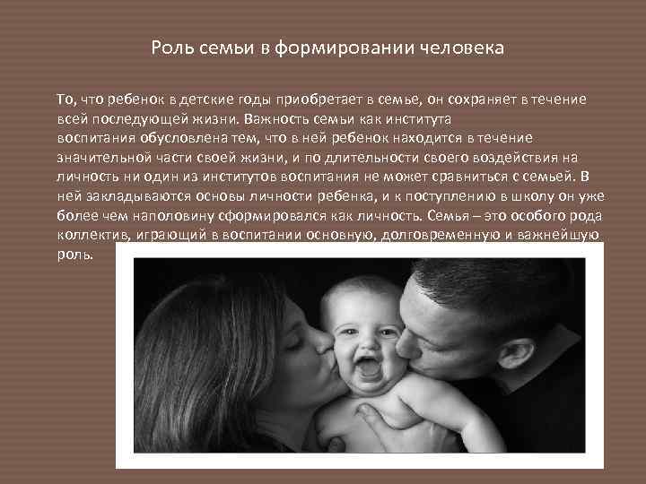 Роль семьи в формировании человека Положительное воздействие семьи на личность ребенка состоит в том, что никто, кроме самых близких для него в семье людей –не относится к ребенку лучше, не любит его так и не заботится столько о нем. И вместе с тем никакой другой социальный институт не может потенциально нанести столько вреда в воспитании детей, сколько может сделать семья.