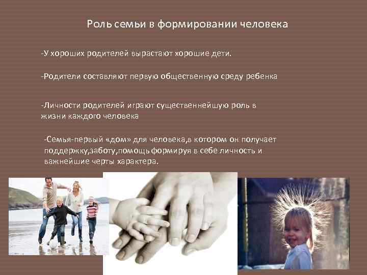 Роль семьи в формировании человека -У хороших родителей вырастают хорошие дети. -Родители составляют первую общественную среду ребенка -Личности родителей играют существеннейшую роль в жизни каждого человека -Семья-первый «дом» для человека, в котором он получает поддержку, заботу, помощь формируя в себе личность и важнейшие черты характера.