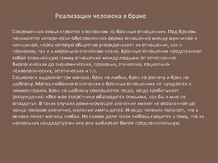 Реализация человека в браке Современная семья строится в основном на брачных отношениях. Под браком понимается исторически обусловленная форма отношений между мужчиной и женщиной, через которую общество упорядочивает их отношения, как в правовом, так и в морально-этическом плане. Брачные отношения представляют собой сложнейшую гамму отношений между людьми: от естественнобиологических до экономических, правовых, этических, социальнопсихологических, эстетических и т. п. Социологи выделяют три мотива: брак по любви, брак по расчету и брак по шаблону. Мотив любовного влечения в брачных отношениях не нуждается в комментариях. Брак по шаблону совершается тогда, когда срабатывает рассуждение: «Все мои сверстники обзаводятся семьями, как бы и мне не опоздать» . В таких случаях доминирующее значение имеют не осознанное до конца половое влечение, желание иметь детей. Иногда человек полагает, что в основе лежат мотивы любви. На самом деле такая любовь сводится к тому, что из нескольких кандидатур он или она выбирают более предпочтительную.