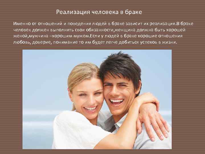 Реализация человека в браке Именно от отношений и поведения людей в браке зависит их реализация. В браке человек должен выполнять свои обязанности, женщина должна быть хорошей женой, мужчина –хорошим мужем. Если у людей в браке хорошие отношения любовь, доверие, понимание то им будет легче добиться успехов в жизни.