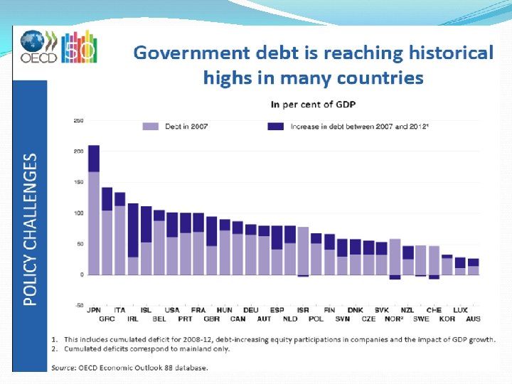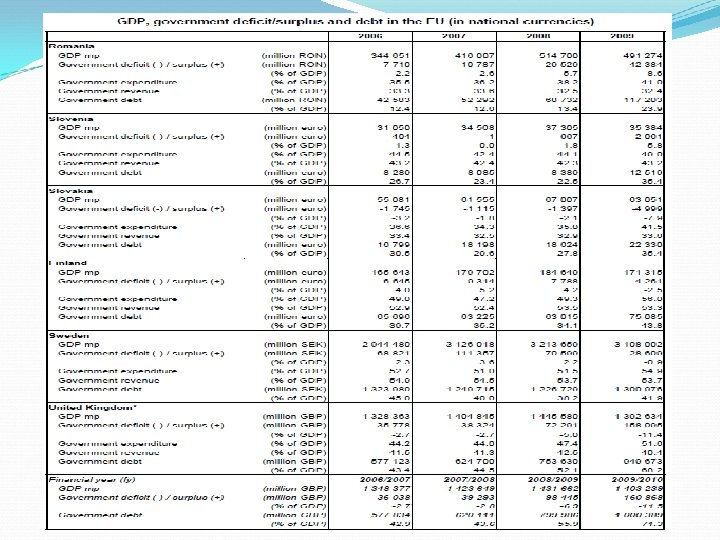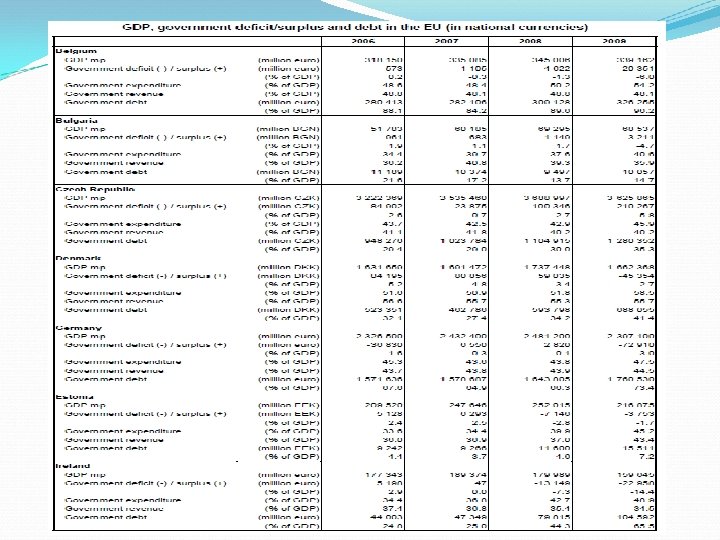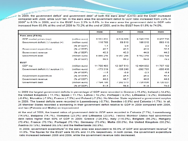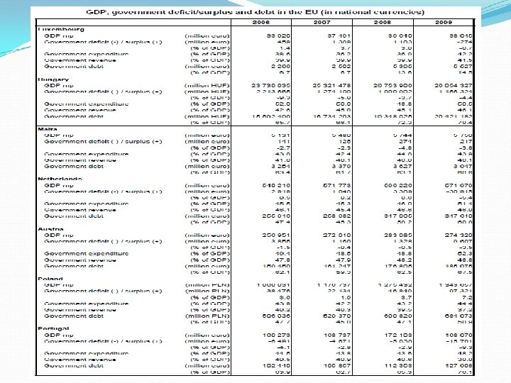 Problemy fiskalne nie opuszczają EU: zagrożona jest Portugalia, której problemy z deficytem budżetowym i długiem publicznym są dość podobne do Irlandii rentowność portugalskich obligacji skarbowych wzrosła w 2010 r. ciemne chmury zbierają się nad Hiszpanią wstępne dane opublikowane przez Eurostat 26 kwietnia 2011 r. przynoszą raczej złe wieści dotyczące finansów publicznych. Na koniec 2010 r. dług publiczny w krajach UE wzrósł do 80% GDP, o 21 p. p. więcej niż poziom z końca 2007 r. W strefie euro dane są jeszcze gorsze: 85, 1% GDP, a więc o blisko 19 p. p. więcej niż na koniec 2007 r. jest to efektem spadku dochodów budżetowych, rosnących nacisków na zwiększanie wydatków oraz konsekwencji dyskrecjonalnej stymulacji fiskalnej.