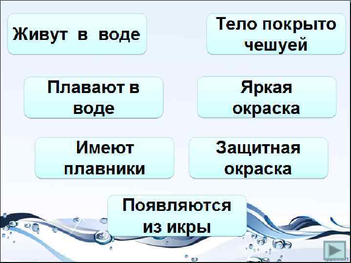 Живут в вод е, реке, озере , море шат Ды ами, жабр тело рыто пок шуёй че Передвигаются с помощью плавников и хвоста