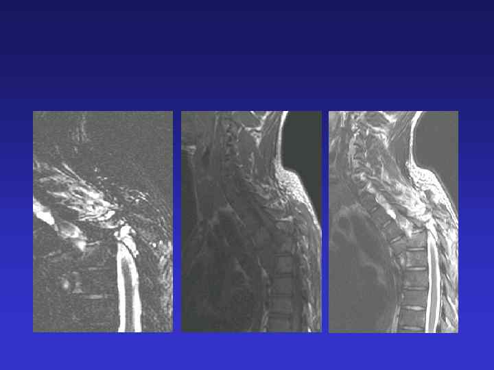 Интрамедуллярная опухоль на уровне 5 -6 грудных позвонков. Аксиальные Т 1 и Т 2 взвешенные изображения Сагиттальные Т 1 и Т 2 -взвешенные изображения шейного и верхнегрудного отделов позвоночника