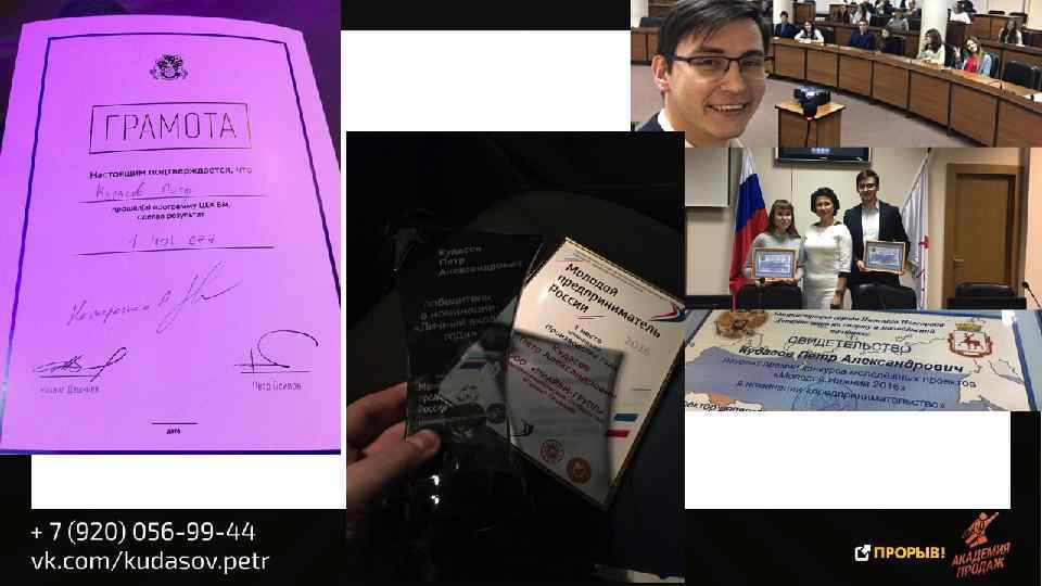 Основатель и ведущий тренер «Прорыва!» Система достижения личных целей • Основатель образовательного проекта «Прорыв!» • Федеральный тренер программы «Ты-предприниматель» • Преподаватель MBA Бизнес-школы ВШЭ «Управление продажами» • Федеральный тренер АТСМ РСМ, ФАДМ, Мин. Образования. • Финалист премии «Бизнес-тренер-2014» по Нижегородской Области, призёр «Молодой предприниматель России-2016» • Преподаватель Образовательного центра «Нетология» • Директор компании «Академия продаж» • Построено 47 отдела продаж, выполнено более 400 проектов • Обучено более 37 000 человек с 2008 года • Получено 70+ благодарственных писем клиентов • Депутат Воскресенского района Нижегородской области