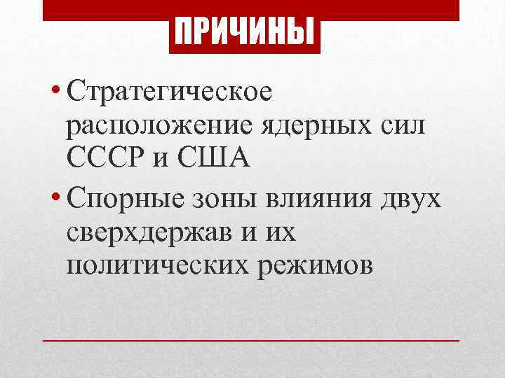 ПРИЧИНЫ • Стратегическое расположение ядерных сил СССР и США • Спорные зоны влияния двух сверхдержав и их политических режимов