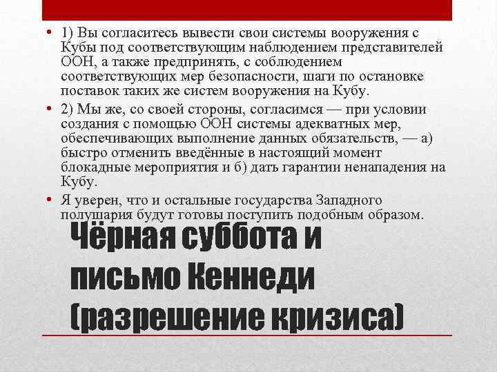 • 1) Вы согласитесь вывести свои системы вооружения с Кубы под соответствующим наблюдением представителей ООН, а также предпринять, с соблюдением соответствующих мер безопасности, шаги по остановке поставок таких же систем вооружения на Кубу. • 2) Мы же, со своей стороны, согласимся — при условии создания с помощью ООН системы адекватных мер, обеспечивающих выполнение данных обязательств, — а) быстро отменить введённые в настоящий момент блокадные мероприятия и б) дать гарантии ненападения на Кубу. • Я уверен, что и остальные государства Западного полушария будут готовы поступить подобным образом. Чёрная суббота и письмо Кеннеди (разрешение кризиса)