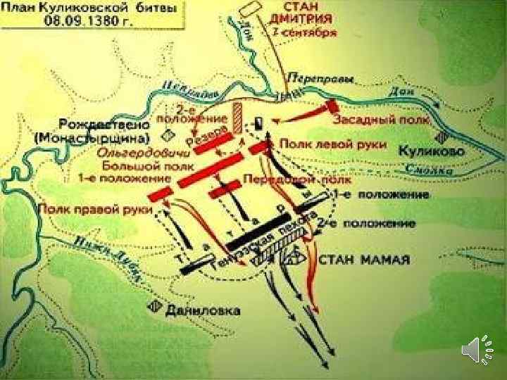 Подготовка к битве Вечером 7 сентября русские войска были выстроены в боевые порядки. Большой полк и весь двор московского князя встали в центре. Ими командовал московский окольничий Тимофей Вельяминов. На флангах стали полк правой руки под командованием литовского князя Андрея Ольгердовича и полк левой руки князей Василия Ярославского и Феодора Моложского. Впереди перед большим полком стал сторожевой полк князей Симеона Оболенского и Иоанна Тарусского. В дубраву вверх по Дону был поставлен засадный полк во главе с Владимиром Андреевичем и Дмитрием Михайловичем Боброком-Волынским. Считается, что засадный полк стоял в дубраве рядом с полком левой руки, однако, в «Задонщине» говорится об ударе засадного полка с правой руки. О делении на полки по родам войск неизвестно. Вечером и ночью 7 сентября Дмитрий Иванович объезжал войска, делая смотр. Тогда же, вечером, татарские передовые части, тесня русских разведчиков Семёна Малика, увидели русские построившиеся войска. В ночь на 8 сентября Дмитрий с Боброком выезжали на разведку и издали осматривали татарские и свои позиции.