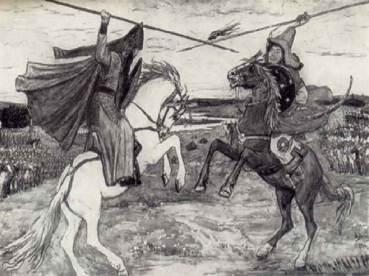 Куликовская битва На битву князя благословил Сергий Радонежский – основатель Троицкого монастыря под Москвой. Он дал Дмитрию Двух монахов своего монастыря – прославленных на Руси воинов – Пересвета и Ослябю. n Существует легенда, что сражение началось с поединка двух воинов-богатырей. Из вражеских рядов выехал на могучем коне телохранитель Мамая – Челубей. Этот вызов принял богатырь Пересвет. С копьем наперевес мчались всадники друг на друга и сшиблись на всем скаку. Кони их едва устояли. А оба воина насмерть поразили друга n