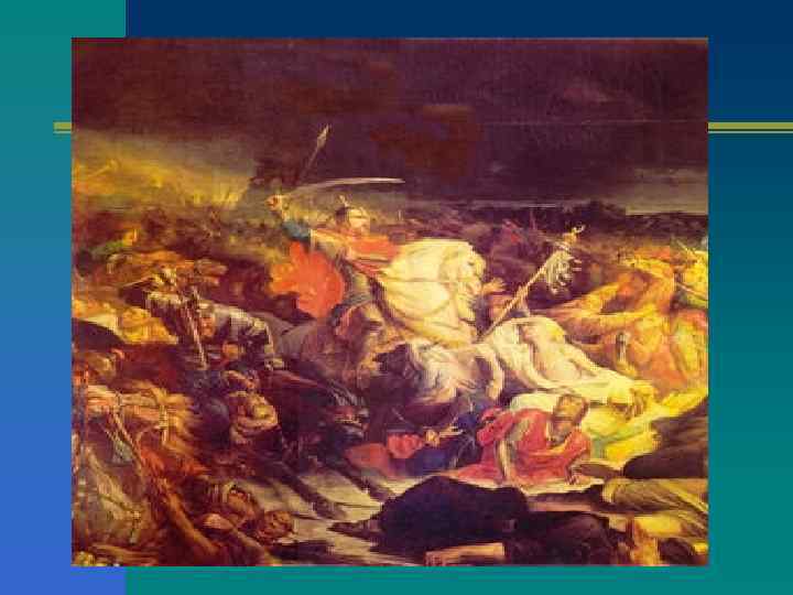 Продолжение n И тут же русские и ордынские полки сошлись в кровавой схватке. Стрелы падали дождем, копья ломались, как солома, молниями сверкали на солнце мечи. Враги начали теснить русских ратников. И тогда внезапно из леса вылетела и ударила по врагу русская конница, находившаяся в засаде. Растерялся неприятель и вскоре обратился в бегство. n Мамай стоял на высоком холме и в смятении наблюдал разгром своих полчищ.