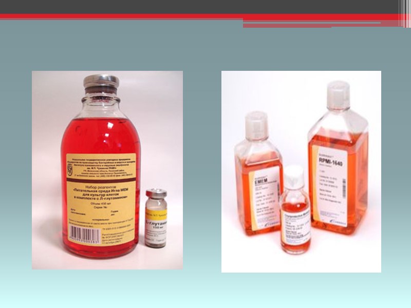 Среды для культуры клеток 1955г. Игл провел анализ компонентов для роста клеток млекопитающих. БСИ:12 незаменимых АК, 9 витаминов; глутамин, антибиотики добавляют вместе с 5% сывороткой КРС(требует ежедневной смены) МСИ:10-кратный концентрат требует разведения дистиллированной водой и послед.добавления глутамина, сыворотки, бикарбоната, антибиотиков.