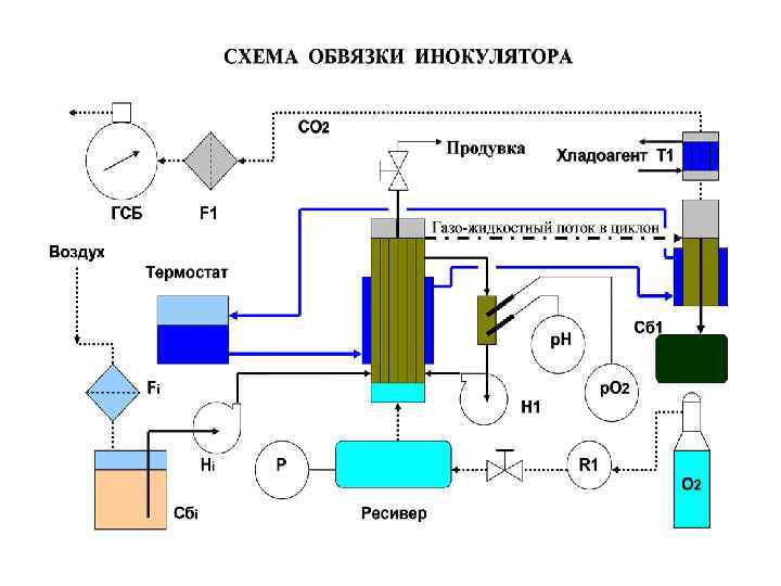 Схема обвязки секционированного аппарата чистой культуры Ф 2 R 1 Блок емкостей для С 1 – С 5 питательных сред и титрующих агентов Отраб. вода Н 1 – Н 5 Воздух отраб. R 2 Ф 3 Охл. вода Блок дозаторов Ф 1 Газоаналитическая станция, О 2, CO 2 Посевной материал Возврат потока Отбор биомассы Рециркуляционный контур Биореактор В атмо сферу Забор воздуха Газ. сч. Охл. вода, пар Ф 4 Отраб. вода, конденсат Отбор фильтрата Н 6 Очищенный воздух Сброс конденсата К 1 Стерильный воздух Пар Отбор КЖ (проб) Обозначения: К – компрессор, Н – насос-дозатор, Ф – фильтр, С – сборник, R - редуктор