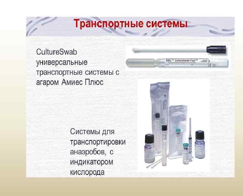 Транспортные среды • • • Пример – транспортная тиогликолевая среда, состав: - Гидролизат казеина – 15 г. - Дрожжевой экстракт – 5 г. - Na. Cl – 2, 5 г. - Тиогликолят натрия – 0, 5 г. - Глюкоза – 5, 5 г. - L-цистин - 0, 5 г. - Резазурин– 0, 001 г. - Агар-агар – 0, 75 г. - Дистиллированная вода – до 1000 мл. Пробирки с транспортными средами предварительно прогревают для удаления диффундировавшего кислорода (редуцируют), пространство над средой заполняют газом тяжелее воздуха (например, пропаном) пробирки закрывают специальными резиновыми пробками. Взятие исследуемого материала из пораженного участка осуществляется шприцем с притертым поршнем, после чего материал вносят в пробирку с транспортной средой, прокалывая пробку.