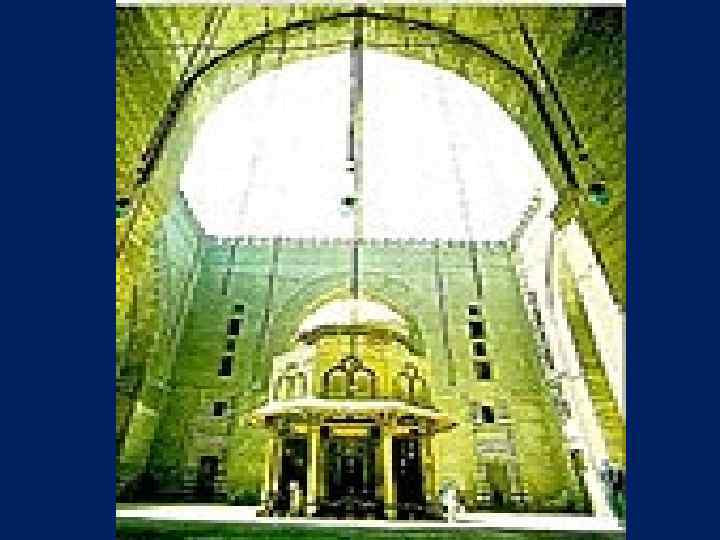 q. Мечеті будувались таким чином. У плані вони мали прямокутну форму. Перед входом був розташований просторий дворик, оточений портиками і звичайно засаджений деревами, з фонтаном посередині (для омовіння правовірних). q Мечеті були увінчані одною або декількома башточками, високими і стрункими мінаретами, з яких муеззін провіщав час початку служби. .