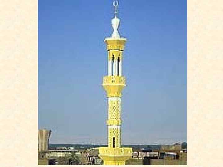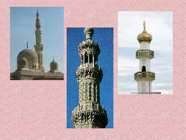 q З давніх часів поруч із мечеттю зводився мінарет. Його походження пов'язують з кількома прообразами: зі сторожовою чи сигнальною вежею, маяком. Мінарет служить для скликання правовірних на молитву, що й виконує спеціальний службовець при мечеті — муедзин. Звичайно мінарет прилягає до мечеті, інколи розташований окремо. q Асиміляція архітектурних особливостей різних культурних регіонів зумовила виникнення оригінальних і не схожих між собою форм мінаретів.