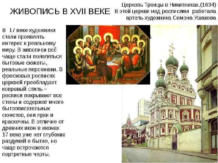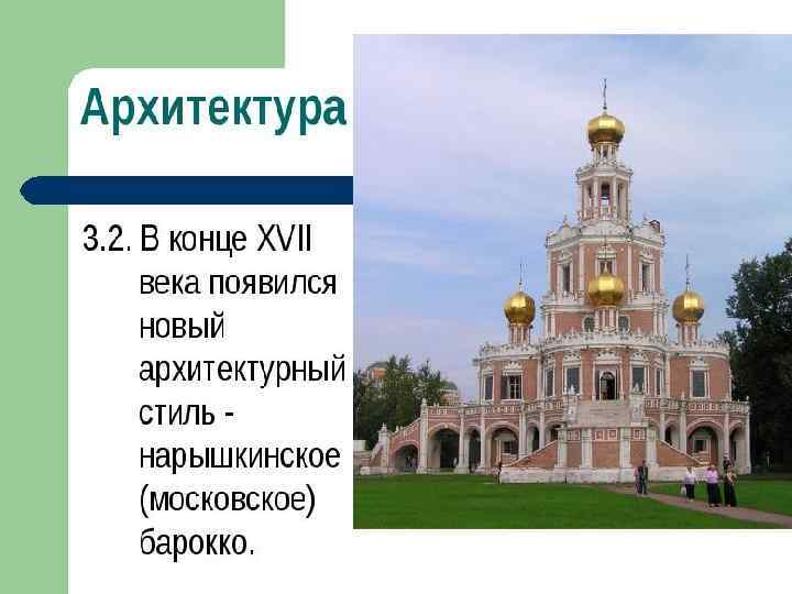 В этот период произошел культурный переворот, в культуру проникли светские элементы. Начался процесс «обмирщения» культуры (от слов «мирский» , «светский» ). Просвещение. Во второй половине XVII века было создано несколько государственных школ, в 1687 году в Москве открыто первое высшее учебное заведение — Славяно-греко-латинская академия. Вышли в свет массовым тиражом учебники ( «Азбука» Василия Бурцева и др. ), книги различного содержания. В 1672 году в Москве была открыта первая книжная лавка. При царском дворе выходила рукописная газета «Куранты» . Литература. В XVII веке были созданы последние летописные сочинения. Главное место в исторической литературе заняли исторические повести ( «Сказание Авраамия Палицына» , «Временник дьяка Ивана Тимофеева» ). Появился новый жанр — сатирическая повесть ( «Служба кабаку» , «Повесть о куре и лисе» и др. ). Новыми жанрами стали мемуары ( «Житее протопопа Аввакума» ) и любовная лирика (Симеон Полоцкий).