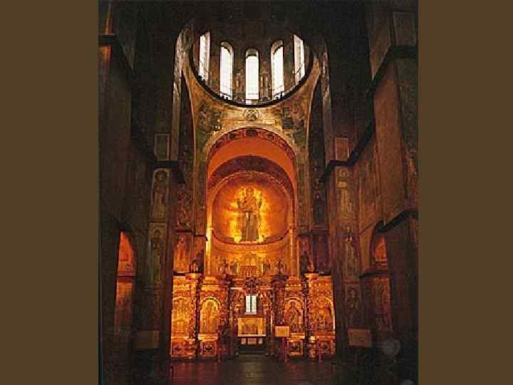 Софийский собор в Киеве. XI в. Построен при Ярославе Мудром (1019 - 1054) византийскими мастерами. Главный центр киевской митрополии. По преданию построен на месте разгрома печенегов в 1036 г. Ярослав Мудрый При Ярославе строятся монастыри: Св. Георгия и св. Ирины в Новгороде, Киево. Печерский – в Киеве