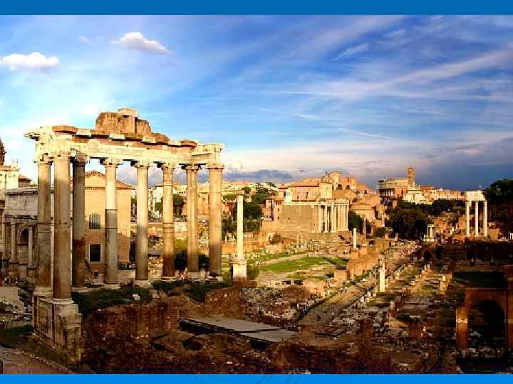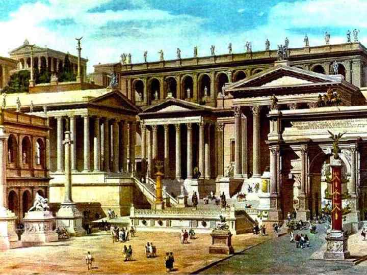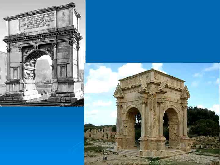Архитектура Ø Появление новых типов построек: форум, триумфальные арки, базилики, акведуки… Ø Новые элементы: аркада, купол Ø Использование бетонирования
