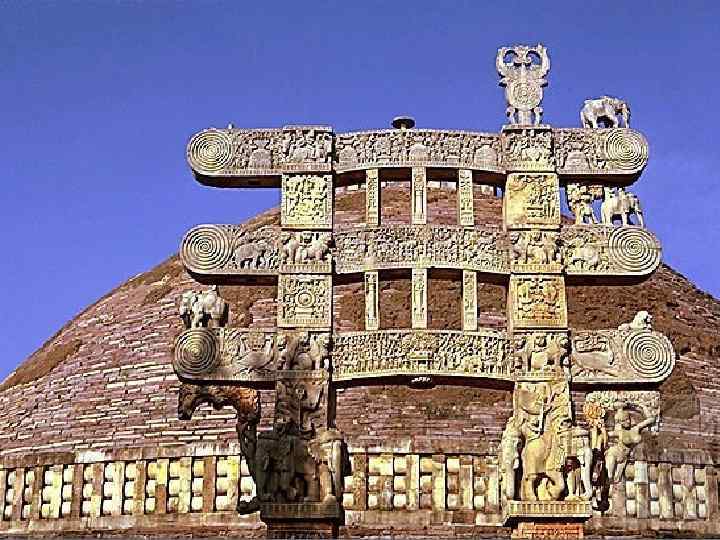 Ворота Санчи Ворота состоят из двух столбов и трех изогнутых горизонтальных балок, которые соединяются скульптурами или плитами. Рельефы на столбах и балках на сюжеты из жизни Будды.