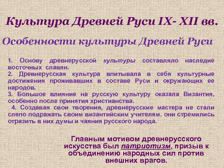 Культура Древней Руси IX- XII вв. Особенности культуры Древней Руси 1. Основу древнерусской культуры составляло наследие восточных славян. 2. Древнерусская культура впитывала в себя культурные достижения проживавших в составе Руси и окружающих ее народов. 3. Большое влияние на русскую культуру оказала Византия, особенно после принятия христианства. 4. Создавая свои творения, древнерусские мастера не стали слепо подражать своим византийским учителям. они стремились отразить в них думы и чаяния русского народа. Главным мотивом древнерусского искусства был патриотизм, призыв к объединению народных сил против внешних врагов.