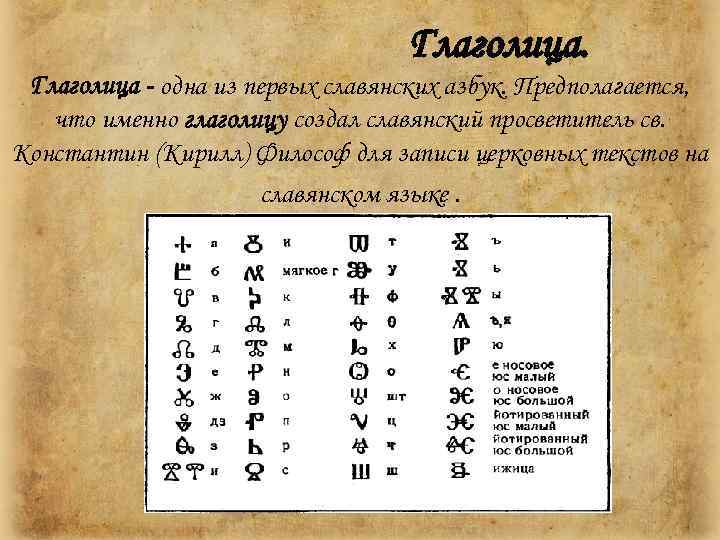 Глаголица - одна из первых славянских азбук. Предполагается, что именно глаголицу создал славянский просветитель св. Константин (Кирилл) Философ для записи церковных текстов на славянском языке.