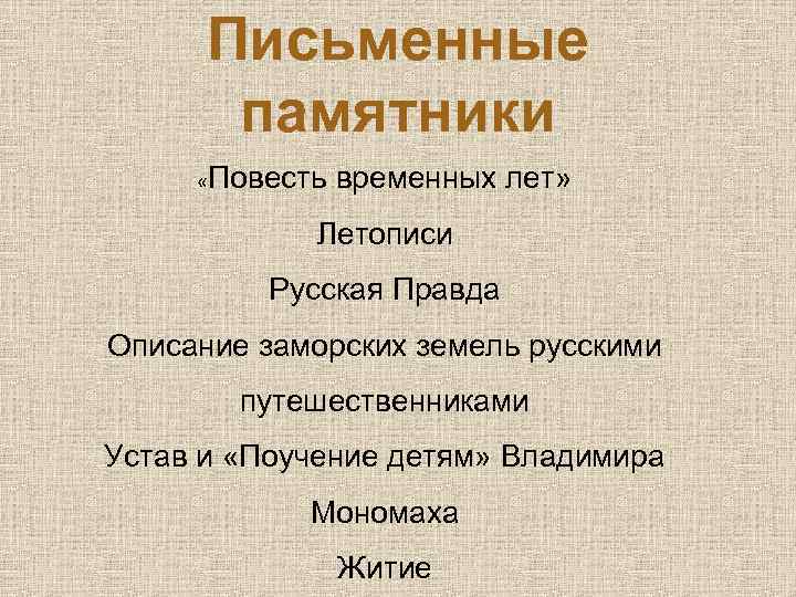 Письменные памятники «Повесть временных лет» Летописи Русская Правда Описание заморских земель русскими путешественниками Устав и «Поучение детям» Владимира Мономаха Житие