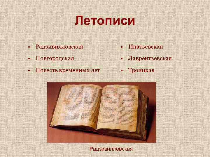 Летописи • Радзивилловская • Ипатьевская • Новгородская • Лаврентьевская • Повесть временных лет • Троицкая Радзивилловская