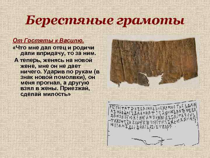 Берестяные грамоты От Гостяты к Василю. «Что мне дал отец и родичи дали впридачу, то за ним. А теперь, женясь на новой жене, мне он не дает ничего. Ударив по рукам (в знак новой помолвки), он меня прогнал, а другую взял в жены. Приезжай, сделай милость»