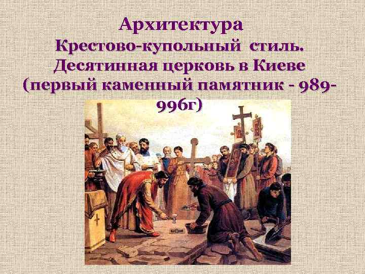 Архитектура Крестово-купольный стиль. Десятинная церковь в Киеве (первый каменный памятник - 989996 г)