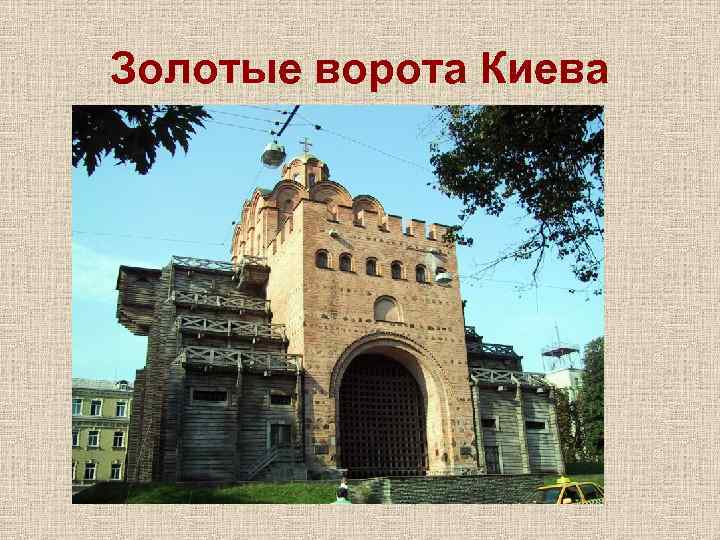 Золотые ворота в Киеве Это— мощная боевая башня с возвышавшейся над нею церковью Благовещения — вызывала восторг современников и навевала ужас на врагов своей неприступностью Золотые ворота были главным въездом в Киев. Здесь находился парадный въезд "в город Ярослава".