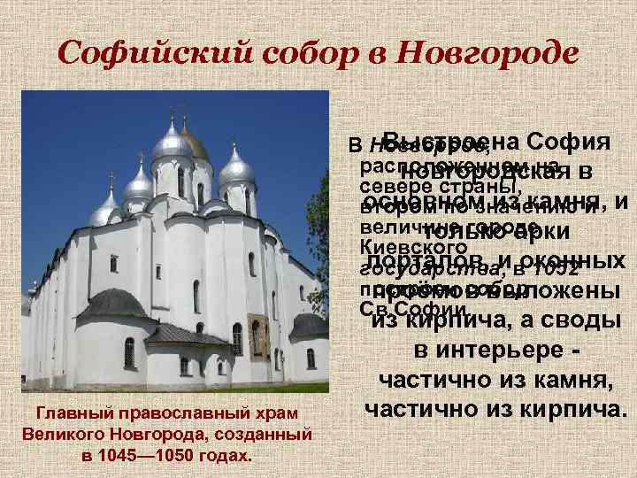 Софийский собор в Новгороде Выстроена София В Новгороде, расположенном на новгородская в севере страны, основном из камня, и втором по значению и величине городе только арки Киевского порталов, и оконных государства, в 1052 построен собор проёмов выложены Св. Софии. Главный православный храм Великого Новгорода, созданный в 1045— 1050 годах. из кирпича, а своды в интерьере - частично из камня, частично из кирпича.