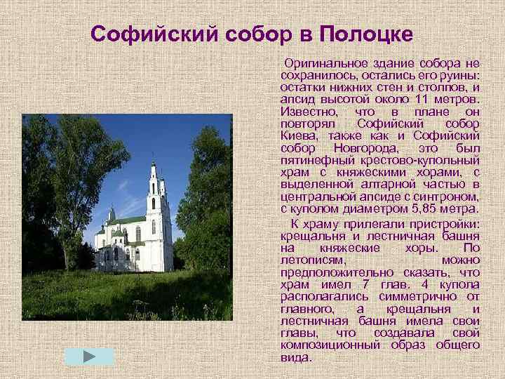 Софийский собор в Полоцке Оригинальное здание собора не сохранилось, остались его руины: остатки нижних стен и столпов, и апсид высотой около 11 метров. Известно, что в плане он повторял Софийский собор Киева, также как и Софийский собор Новгорода, это был пятинефный крестово-купольный храм с княжескими хорами, с выделенной алтарной частью в центральной апсиде с синтроном, с куполом диаметром 5, 85 метра. К храму прилегали пристройки: крещальня и лестничная башня на княжеские хоры. По летописям, можно предположительно сказать, что храм имел 7 глав. 4 купола располагались симметрично от главного, а крещальня и лестничная башня имела свои главы, что создавала свой композиционный образ общего вида.