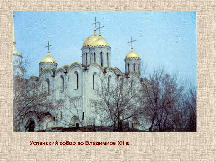 Успенский собор во Владимире • Построен в 1158 – 1160 г. г. • Перестроен в 1185 – 1189 г. г. • В интерьере храма использовались фрески XI – XII в. в. и фрески 1408 г. работы Андрея Рублева и Даниила Черного • В 1862 г. к собору была пристроена колокольня и придел Георгия