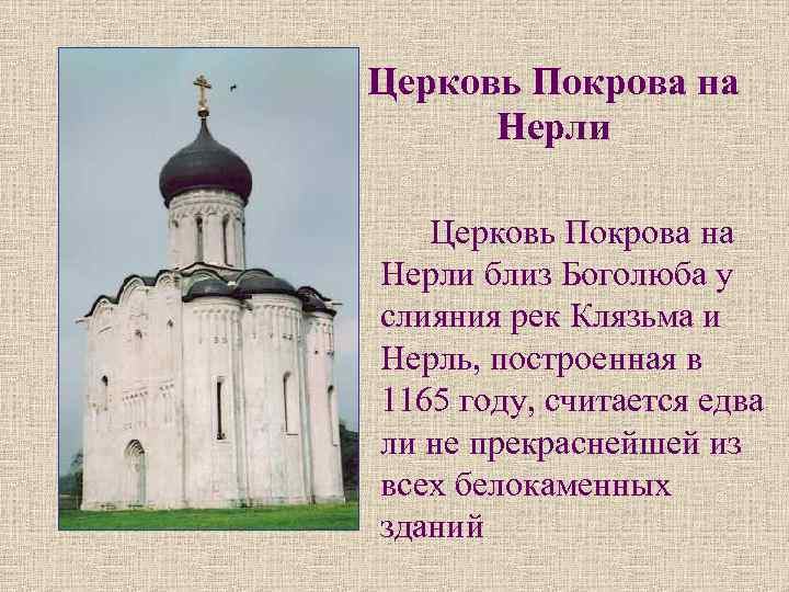 Церковь Покрова на Нерли близ Боголюба у слияния рек Клязьма и Нерль, построенная в 1165 году, считается едва ли не прекраснейшей из всех белокаменных зданий