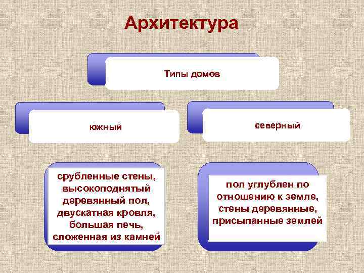 Архитектура Типы домов южный срубленные стены, высокоподнятый деревянный пол, двускатная кровля, большая печь, сложенная из камней северный пол углублен по отношению к земле, стены деревянные, присыпанные землей