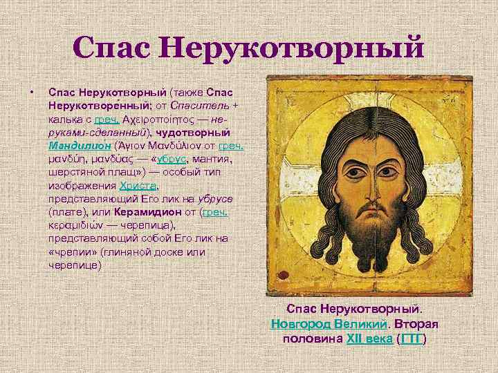 Спас Нерукотворный • Спас Нерукотворный (также Спас Нерукотворе нный; от Спаситель + калька с греч. Αχειροποίητος — неруками-сделанный), чудотворный Мандилио н (Άγιον Μανδύλιον от греч. μανδύη, μανδύας — «убрус, мантия, шерстяной плащ» ) — особый тип изображения Христа, представляющий Его лик на убрусе (плате), или Керамидион от (греч. κεραμιδιών — черепица), представляющий собой Его лик на «чрепии» (глиняной доске или черепице) Спас Нерукотворный. Новгород Великий. Вторая половина XII века (ГТГ)