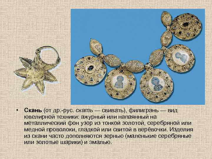 Скань • Скань (от др. -рус. скать — свивать), филигрань — вид ювелирной техники: ажурный или напаянный на металлический фон узор из тонкой золотой, серебряной или медной проволоки, гладкой или свитой в верёвочки. Изделия из скани часто дополняются зернью (маленькие серебряные или золотые шарики) и эмалью.