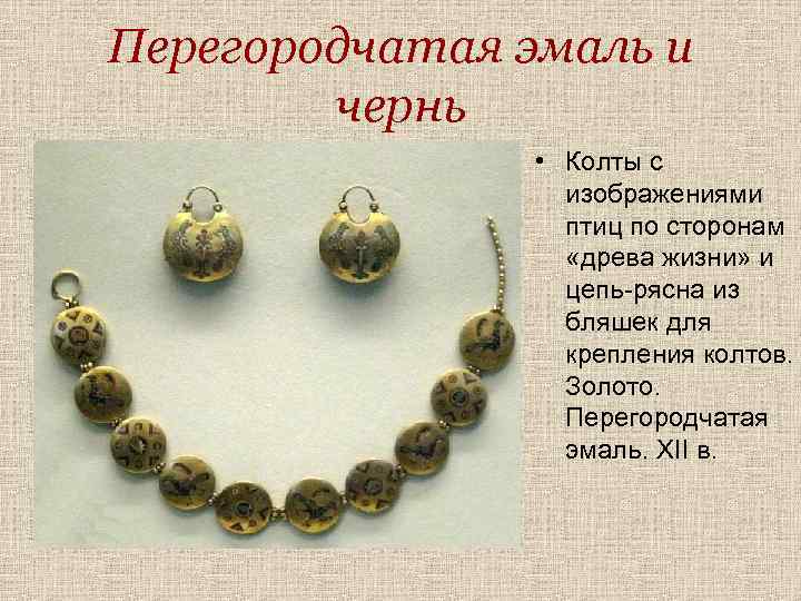 Перегородчатая эмаль и чернь • Колты с изображениями птиц по сторонам «древа жизни» и цепь-рясна из бляшек для крепления колтов. Золото. Перегородчатая эмаль. XII в.