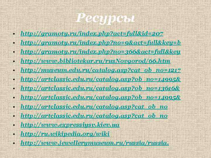 Ресурсы • http: //gramoty. ru/index. php? act=full&id=207 • http: //gramoty. ru/index. php? no=9&act=full&key=b • http: //gramoty. ru/index. php? no=366&act=full&key • http: //www. bibliotekar. ru/rus. Novgorod/66. htm • http: //museum. edu. ru/catalog. asp? cat_ob_no=1217 • http: //artclassic. edu. ru/catalog. asp? ob_no=14995& • http: //artclassic. edu. ru/catalog. asp? ob_no=13616& • http: //artclassic. edu. ru/catalog. asp? ob_no=14995& • http: //artclassic. edu. ru/catalog. asp? cat_ob_no • http: //www. expressiysv. kiev. ua • http: //ru. wikipedia. org/wiki • http: //www. jewellerymuseum. ru/russia.