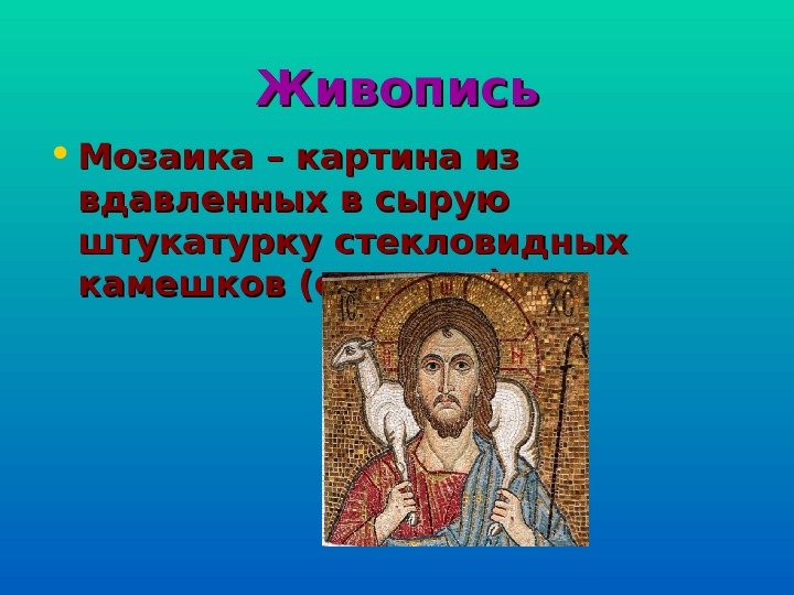Живопись • Мозаика – картина из вдавленных в сырую штукатурку стекловидных камешков (смальты)