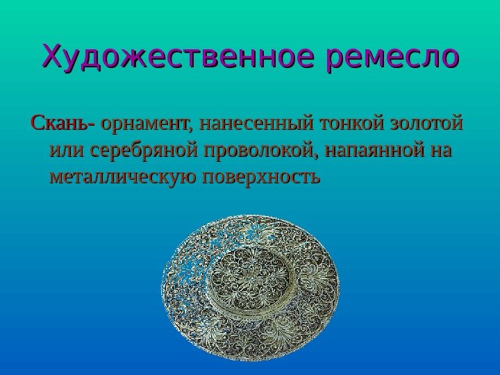 Художественное ремесло Скань- орнамент, нанесенный тонкой золотой или серебряной проволокой, напаянной на металлическую поверхность