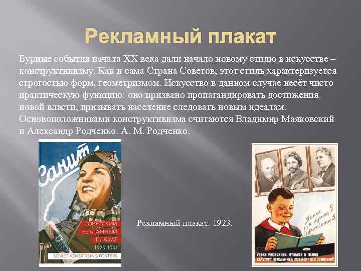 Рекламный плакат Бурные события начала XX века дали начало новому стилю в искусстве – конструктивизму. Как и сама Страна Советов, этот стиль характеризуется строгостью форм, геометризмом. Искусство в данном случае несёт чисто практическую функцию: оно призвано пропагандировать достижения новой власти, призывать население следовать новым идеалам. Основоположниками конструктивизма считаются Владимир Маяковский и Александр Родченко. А. М. Родченко. Рекламный плакат. 1923.