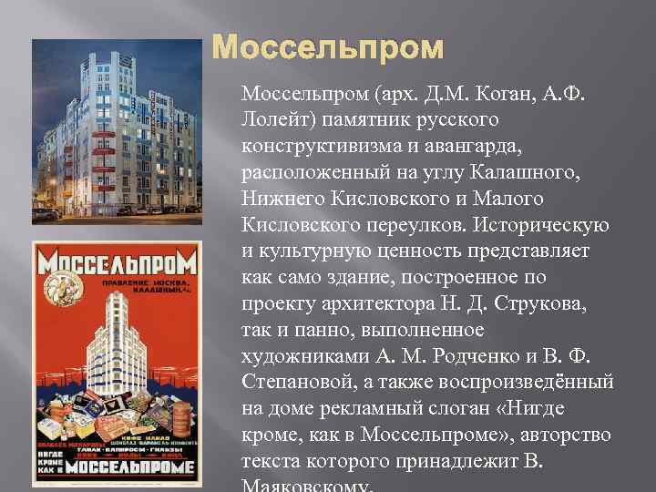 Моссельпром (арх. Д. М. Коган, А. Ф. Лолейт) памятник русского конструктивизма и авангарда, расположенный на углу Калашного, Нижнего Кисловского и Малого Кисловского переулков. Историческую и культурную ценность представляет как само здание, построенное по проекту архитектора Н. Д. Струкова, так и панно, выполненное художниками А. М. Родченко и В. Ф. Степановой, а также воспроизведённый на доме рекламный слоган «Нигде кроме, как в Моссельпроме» , авторство текста которого принадлежит В.