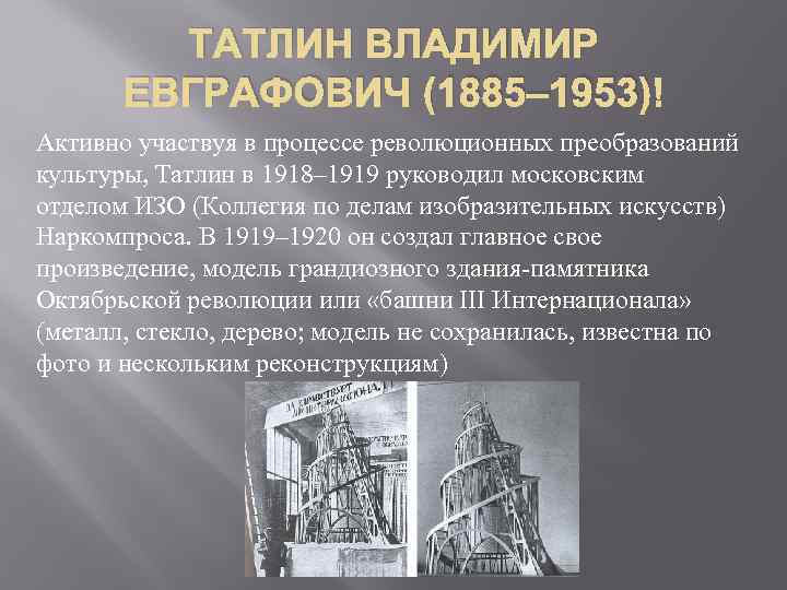 ТАТЛИН ВЛАДИМИР ЕВГРАФОВИЧ (1885– 1953) Активно участвуя в процессе революционных преобразований культуры, Татлин в 1918– 1919 руководил московским отделом ИЗО (Коллегия по делам изобразительных искусств) Наркомпроса. В 1919– 1920 он создал главное свое произведение, модель грандиозного здания-памятника Октябрьской революции или «башни III Интернационала» (металл, стекло, дерево; модель не сохранилась, известна по фото и нескольким реконструкциям)